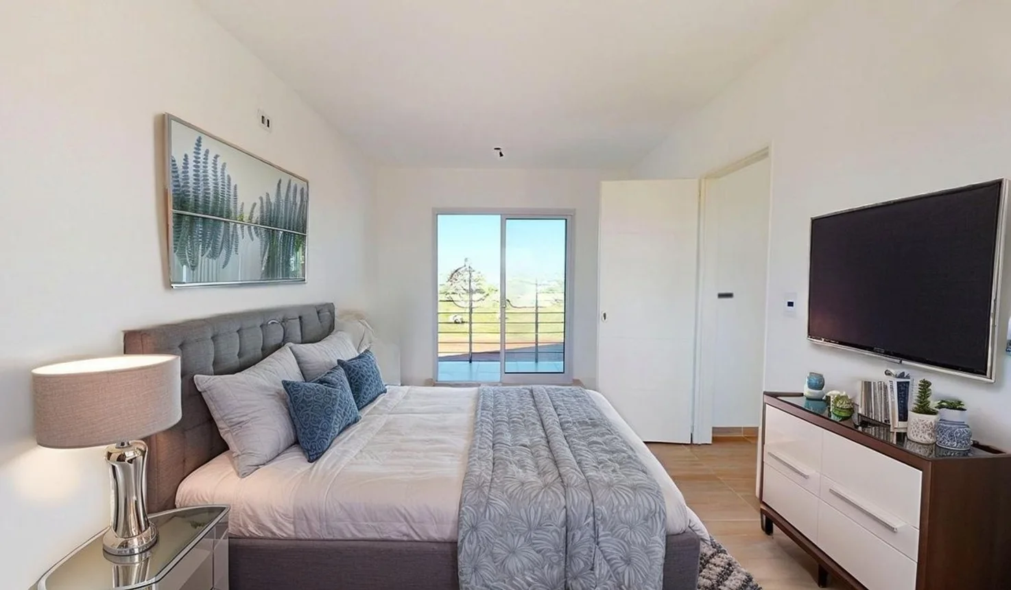 En planta alta, ofrece tres dormitorios luminosos, el principal con balcón y vista a la piscina, y baño completo.